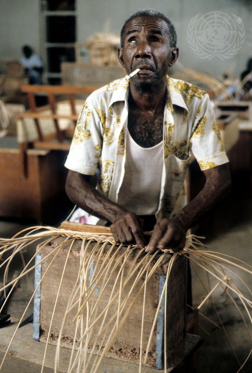 A blind person engaged in weaving at St. Ann's Hospital in Trinidad and Tobago. [1979]