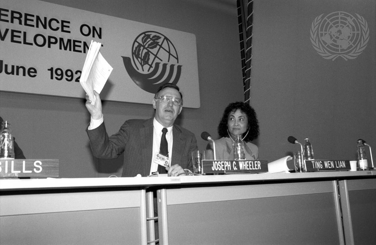 Joseph Wheeler, Director, Programme Integration, UNCED, and Ting Wen Lian, Ambassador of Malaysia to Italy, speak to correspondents about “Agenda 21” and the “Statement of Principles of Sustainable Forest Management” during a press briefing on 2 June, the day before the opening of the United Nations Conference on Environment and Development (UNCED) – or Earth Summit.