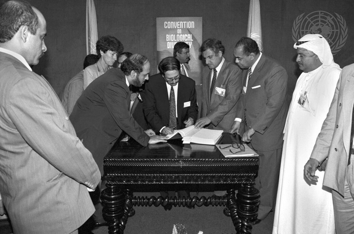 Shaikh Ahmed Bin Saif al-Thani, Minister of Justice and Acting Minister of Public Health, Qatar, signs the Convention on Biological Diversity on behalf of Qatar. Witnessing the signing are Francoise Belmont, Chief of Office of Executive Director, United Nations Environment Programme (UNEP), and delegates of Qatar.