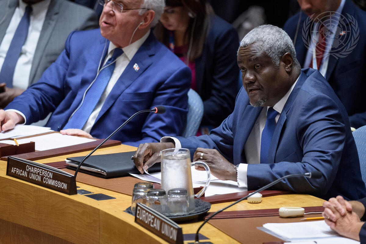 "Moussa Faki Mahamat (right), Chairperson of the African Union Commission,