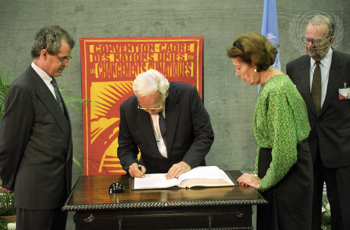 Price Rainer III of Monaco signs the United Nations Framework Convention on Climate Change on behalf of Monaco. Witnessing the signing, from left to right, are Michael Zammit Cutajar, Executive Secretary, Intergovernmental Negotiating Committee for a Framework Convention on Climate Change (INC/FCCC); Marie-Louise Quere-Messing, Chief, Treaty Section, Office of Legal Affairs; and Jean Ripert, Chairman, INC/FCCC.