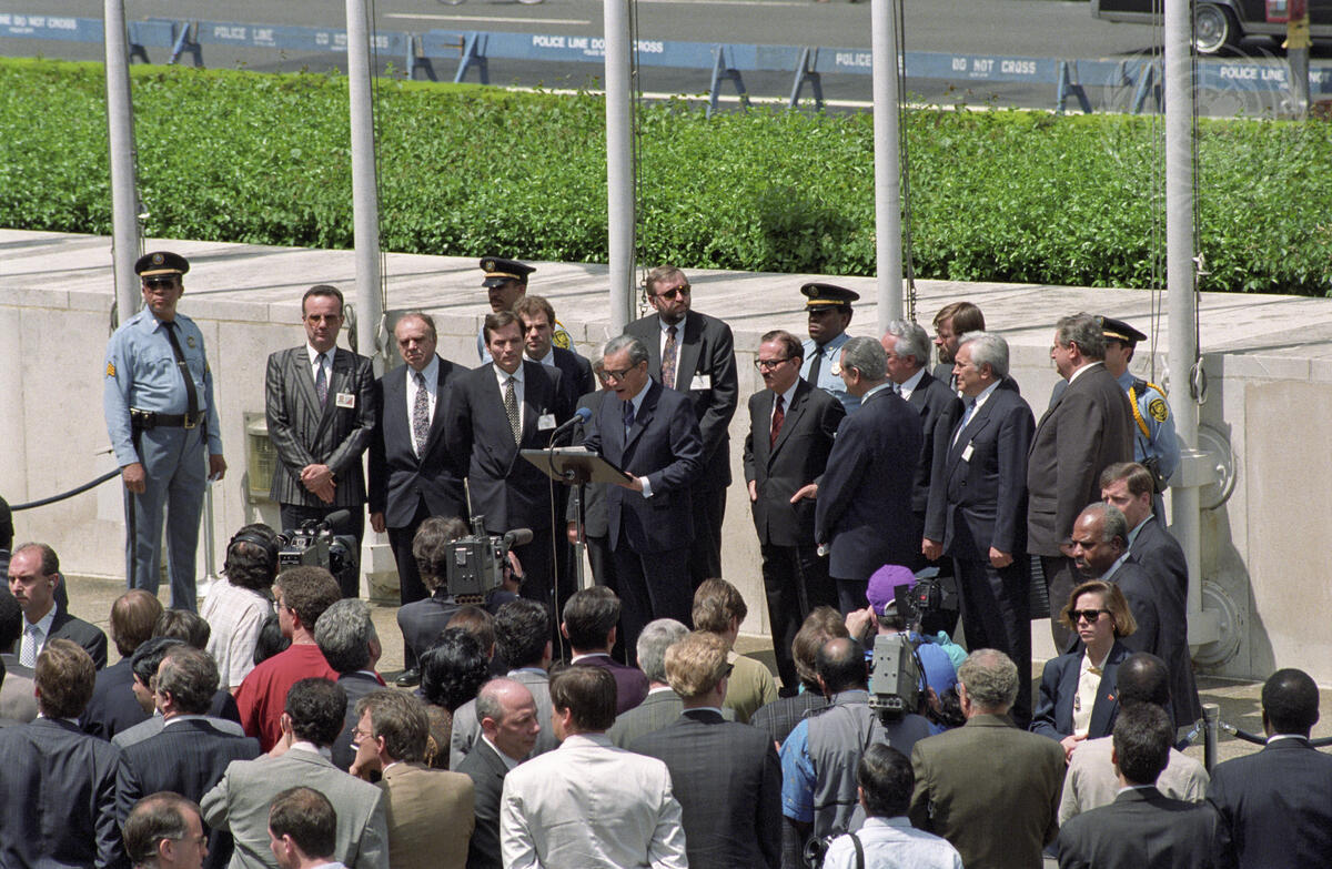 Secretary-General Boutros Boutros-Ghali (at podium) makes a statement during the ceremonies. Pictured left to right: Dr. Haris Silajdzic, Minister for Foreign Affairs for Bosnia and Herzegovina; Milan Kucan, President of Slovenia; Secretary-General Boutros Boutros-Ghali; General Assembly President Samir S. Shihabi (Saudi Arabia) and Dr. Franjo Tudjman, President of Croatia.