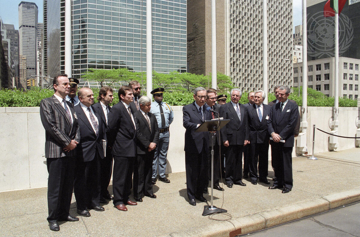 Secretary-General Boutros Boutros-Ghali (at podium) makes a statement during the ceremonies. Pictured left to right: Dr. Haris Silajdzic, Minister for Foreign Affairs for Bosnia and Herzegovina; Milan Kucan, President of Slovenia; Secretary-General Boutros Boutros-Ghali; General Assembly President Samir S. Shihabi (Saudi Arabia) and Dr. Franjo Tudjman, President of Croatia.