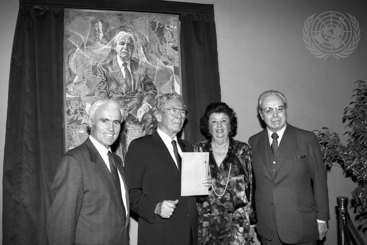 Former Secretary-General Javier Perez de Cuellar (right) is honoured today with the unveiling of his portrait during a special ceremony at the United Nations. With Mr. Perez de Cuellar from left to right are: Yves Piaget, friend of artist Hans Erni; Mr. Erni; and Annabelle Wiener, Deputy Secretary-General of the World Federation of United Nations Associations.