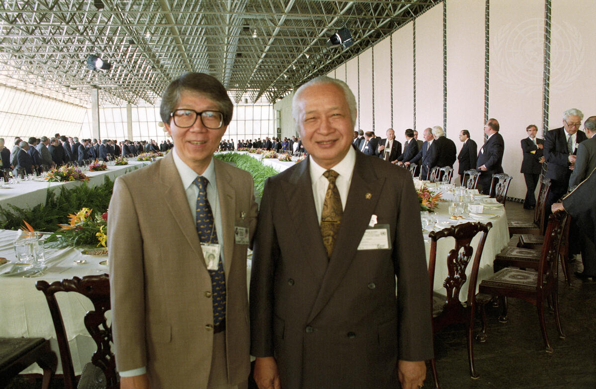 Tommy Koh, Chairman of the Main Committee (left), with Prince Norodom Sihanouk, President of the Supreme national Council of Cambodia (SNC), at a luncheon of world leaders on 14 June.
