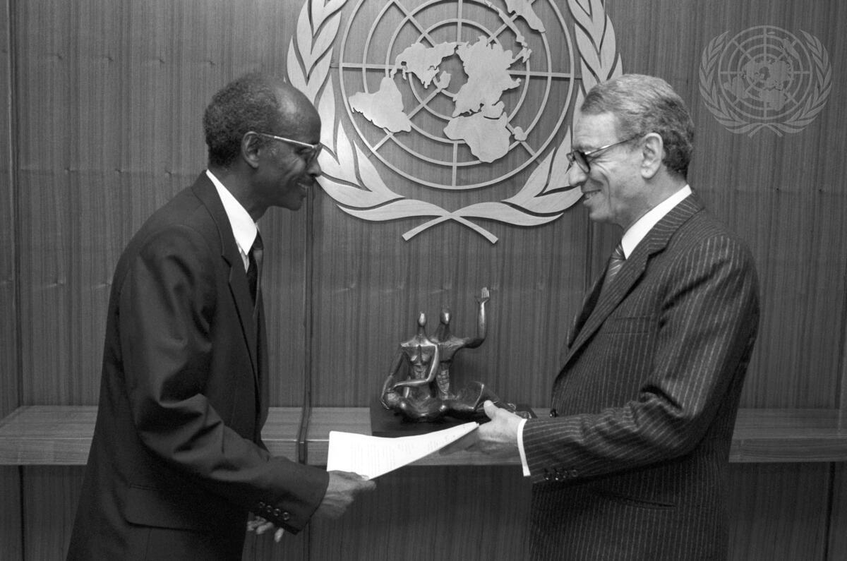 Ambassador Mulugeta Eteffa (left), Permanent Representative of Ethiopia to the United Nations, presents his credentials to Secretary-General Boutros Boutros-Ghali.