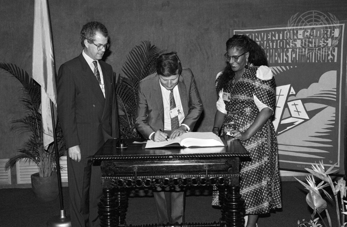 Dr. Julio Cesar Balino, Under-Secretary-General, Minister of Environment, Uruguay, signs the United Nations Framework Convention on Climate Change on behalf of Uruguay. Witnessing the signing, from left to right, are Michael Zammit Cutajar, Executive Secretary, Intergovernmental Negotiating Committee for Framework Convention on Climate Change (INC/FCCC), and Jo Butler, Legal Advisor, INC/FCCC.