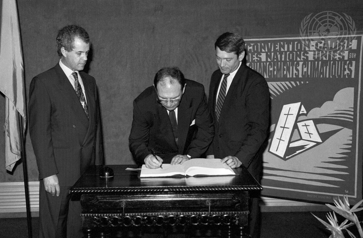 Eidur Gudnason, Minister for the Environment, Iceland, signs the United Nations Framework Convention on Climate Change on behalf of Iceland. Witnessing the signing, from left to right, are Michael Zammit Cutajar, Executive Secretary, Intergovernmental Negotiating Committee for Framework Convention on Climate Change (INC/FCCC), and Larry Johnson, Principal Legal Officer, Office of the Legal Counsel, Office of Legal Affairs.