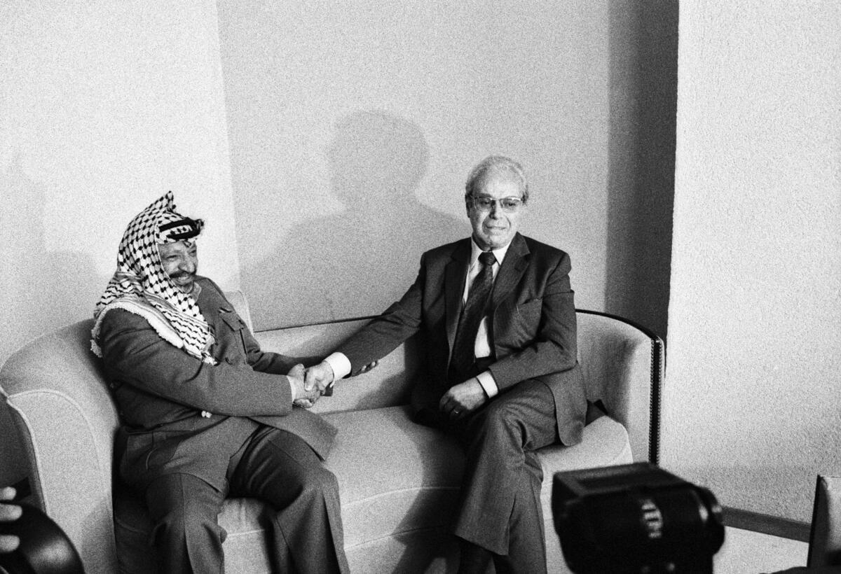 Secretary-General Javier Pérez de Cuéllar (right) meets with Yasser Arafat, Chairman of the Executive Committee of the Palestine Liberation Organization (PLO).