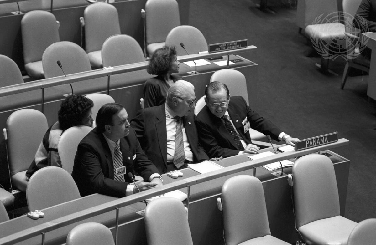The delegation of Panama, headed by Foreign Minister Julio E. Linares (behind name plate), attends the 45th session of the General Assembly.