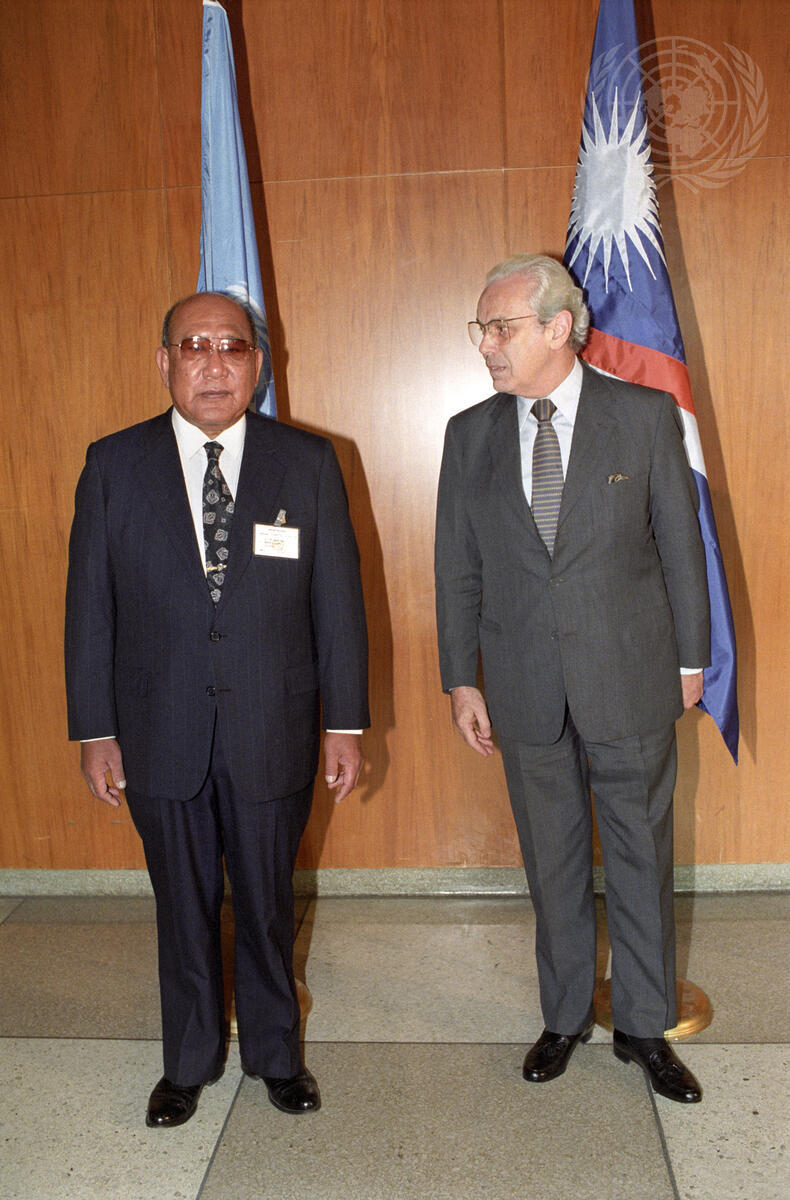 Secretary-General Javier Perez de Cuellar (right) greets President Anata Kabua of the Marshall Islands, on his arrival at the United Nations.