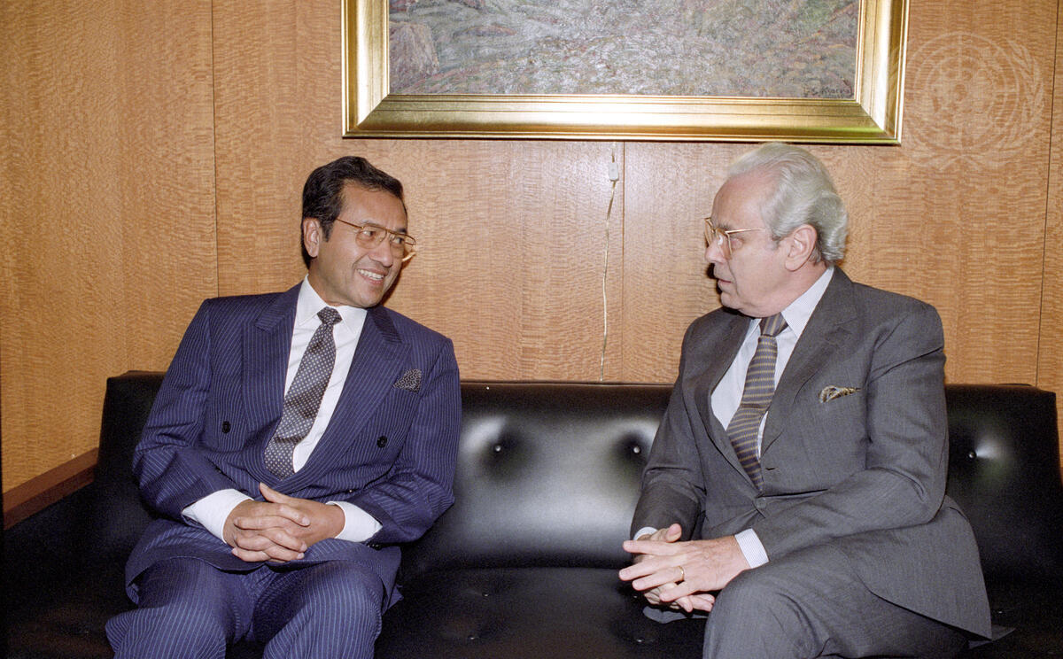 Secretary General Javier Perez De Cuellar (right) meets with Mahathir Mohamad, Prime Minister of Malaysia.