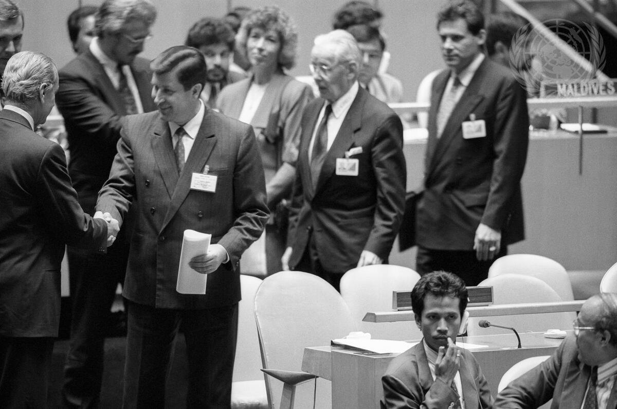 Members of the delegation of Latvia being led to their seats in General Assembly hall by Aly Teymour (far left), Assistant Secretary-General, Chief of Protocol. Mr. Teymour is seen shaking hands with Anatolijs Gorbunovs, Chairman of the Supreme Council of the Republic of Latvia and head of his nation’s delegation.