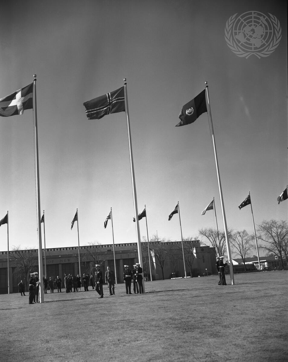 The flags of Sweden, left, Iceland, centre, and Afghanistan which were raised for the first time on the grounds of the General Assembly interim headquarters at Flushing Meadows as representatives of the three new Member States of the United Nations took their places on the floor of the meeting Hall at Flushing Meadows, New York. 19 November 1946.
