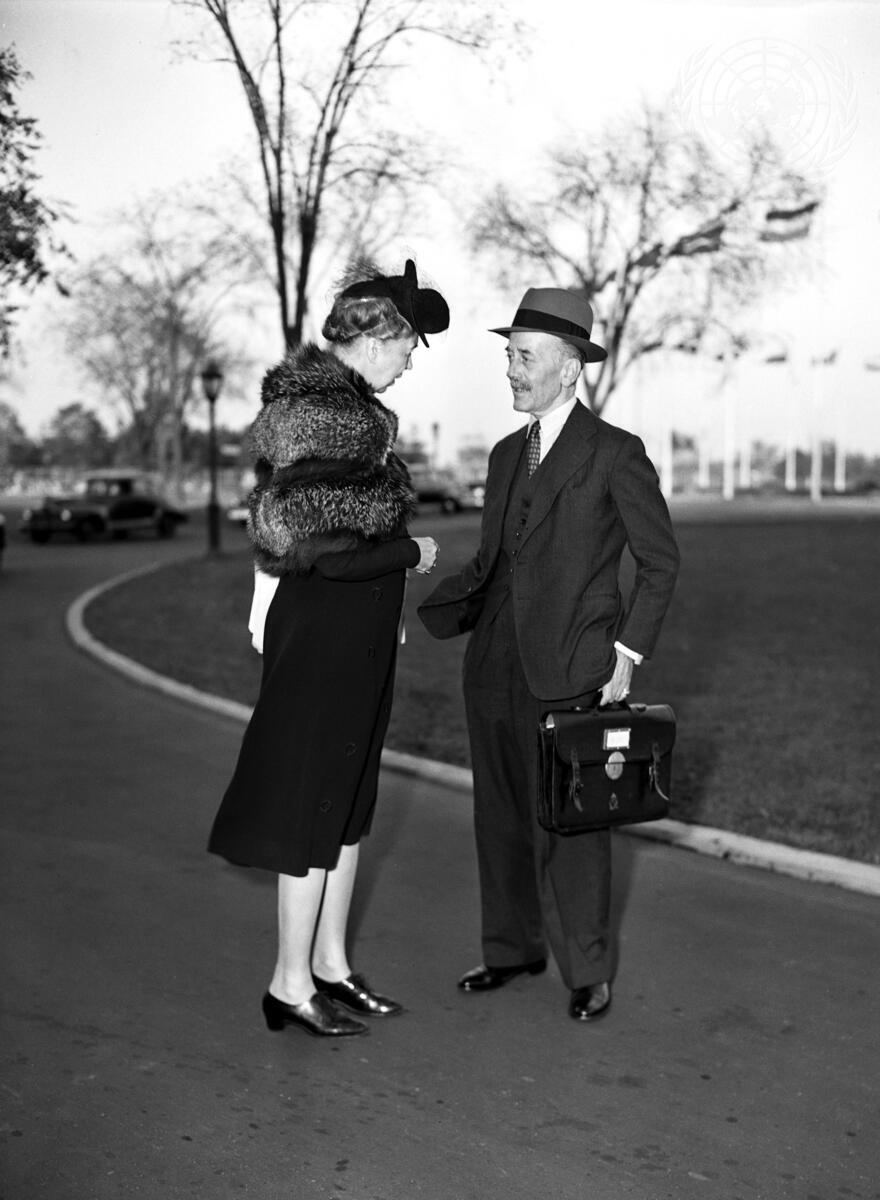 Eleanor Roosevelt, United States (left), speaks with Sir Alexander Cadogan, United Kingdom.