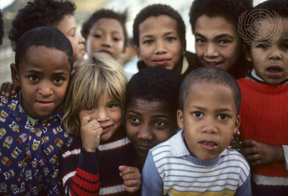 ""Coloured"" children of South Africa near Hout Bay, Cape Province. Everyone in South Africa is classified by race. The four main groups are: Africans, an estimated 71.2% of the total; Whites, 16.2%; Coloureds - people of mixed descent, 9.4%; and Asians, 2.9%. [Exact date unknown]