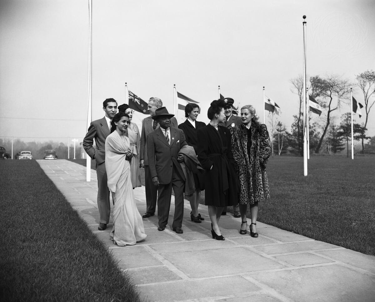 Members of the United Nations Secretariat walking toward the entrance of the North building at Lake Success headquarters.