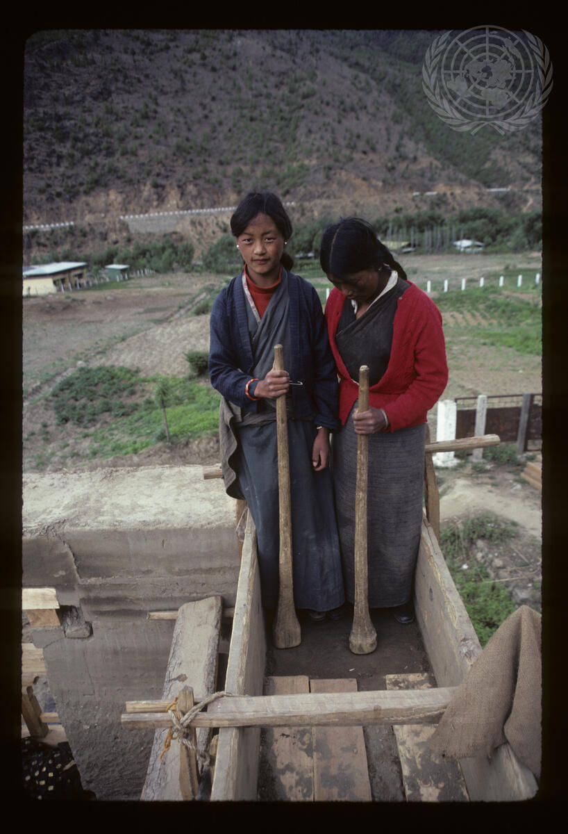 Two young girls helping in house construction in Bhutan. [1981]