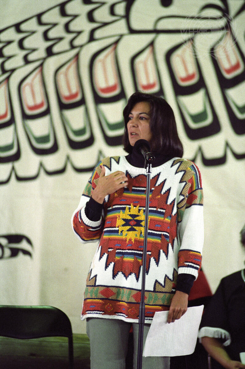 First Nations Women's Day keynote speaker, Chief Wendy Grant, of the Musqueam Band in Vancouver, British Columbia, addressing the gathering at the First Nations Women's Day.