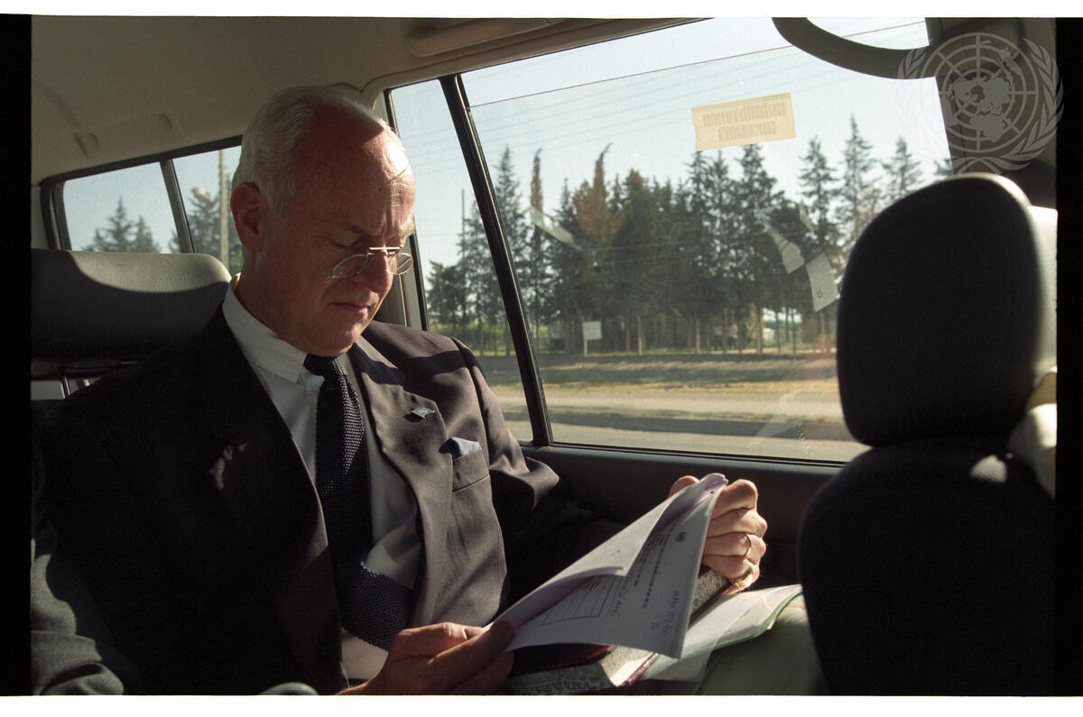 Staffan de Mistura, United Nations Humanitarian Coordinator for Iraq, reviews a report as he travels through Iraq.
