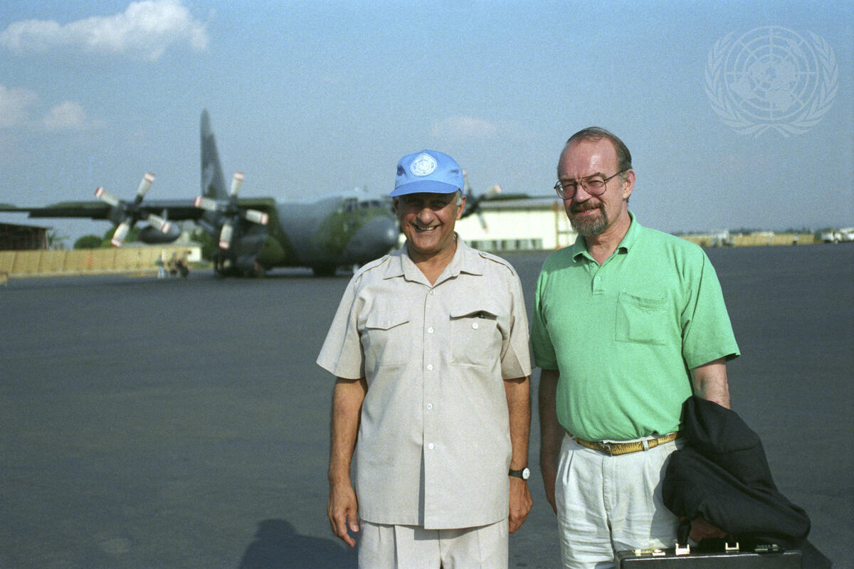 Peter Hansen (right), Emergency Relief Coordinator and Under-Secretary-General for Humanitarian Affairs, poses with Shahryar M. Khan, Special Representative of the Secretary-General for Rwanda, shortly before his departure from Rwanda.