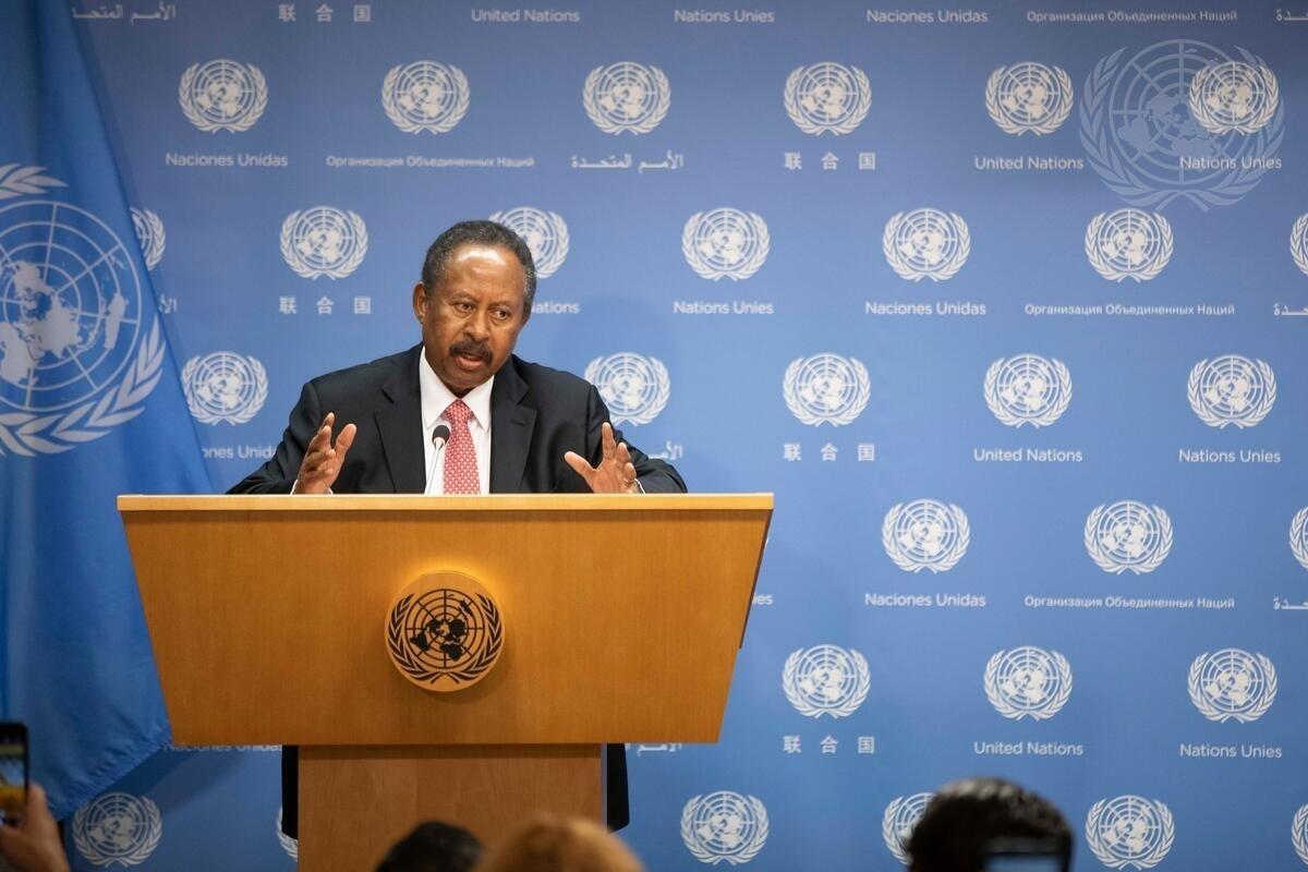Abdalla Hamdok, Prime Minister of the Republic of the Sudan, briefs reporters following a UN high-level meeting on his country.