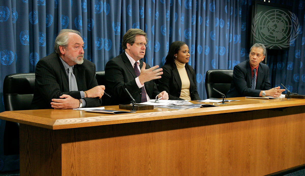 William Pace (second from left), Coordinator for Institute for Global Policy, addresses a press conference to launch the Global Civil Society Coalition for the Responsibility to Protect. Also participating in the press conference (from left to right): Andres Serbin, Coordinadora Regional de Investigaciones Económicas y Sociales; Thelma Ekiyor, West African Civil Society Institute; and Augusto Miclat, Initiatives for International Dialogue.