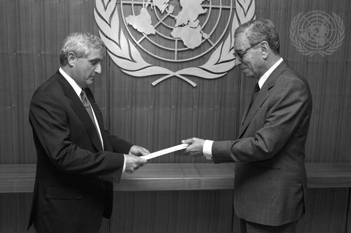 Jacques Louis Laurent Charles Boisson, Permanent Representative of Monaco (left), presents his credentials to Secretary-General Boutros Boutros-Ghali.