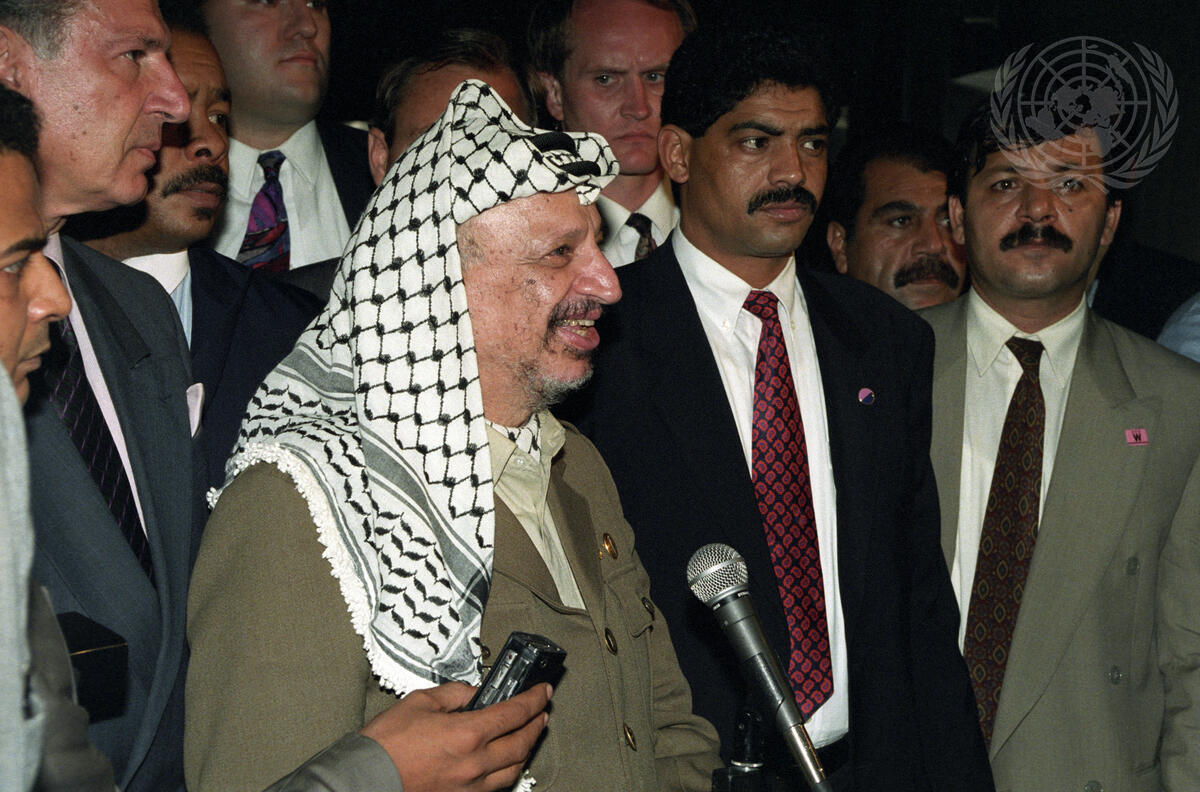 Yasser Arafat (foreground, left of microphone), Chairman of the Executive Committee of the Palestine Liberation Organization (PLO), speaking to correspondents during his visit to UN Headquarters.