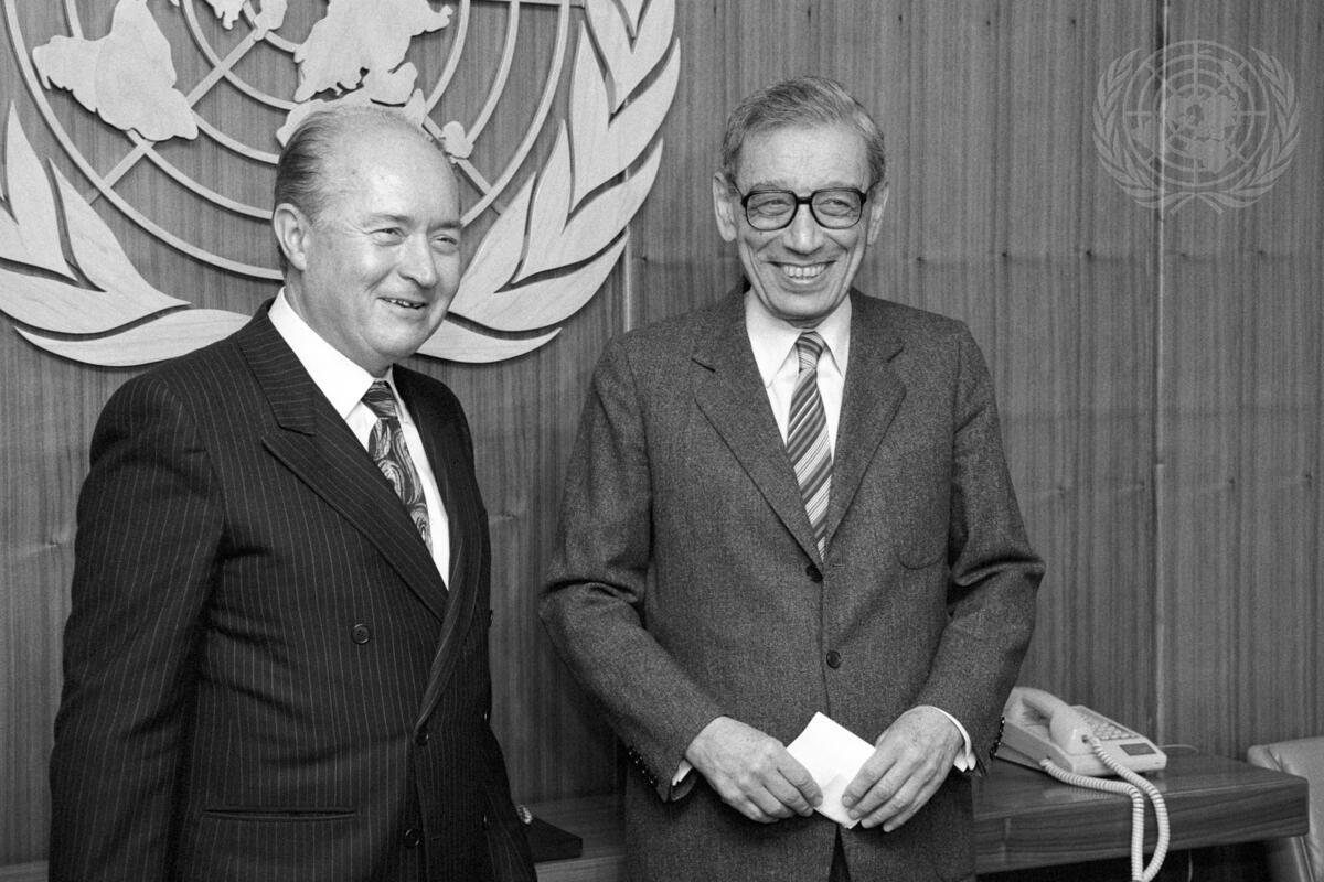 Secretary-General Boutros Boutros-Ghali (right) meets with President George Vassiliou of Cyprus.
