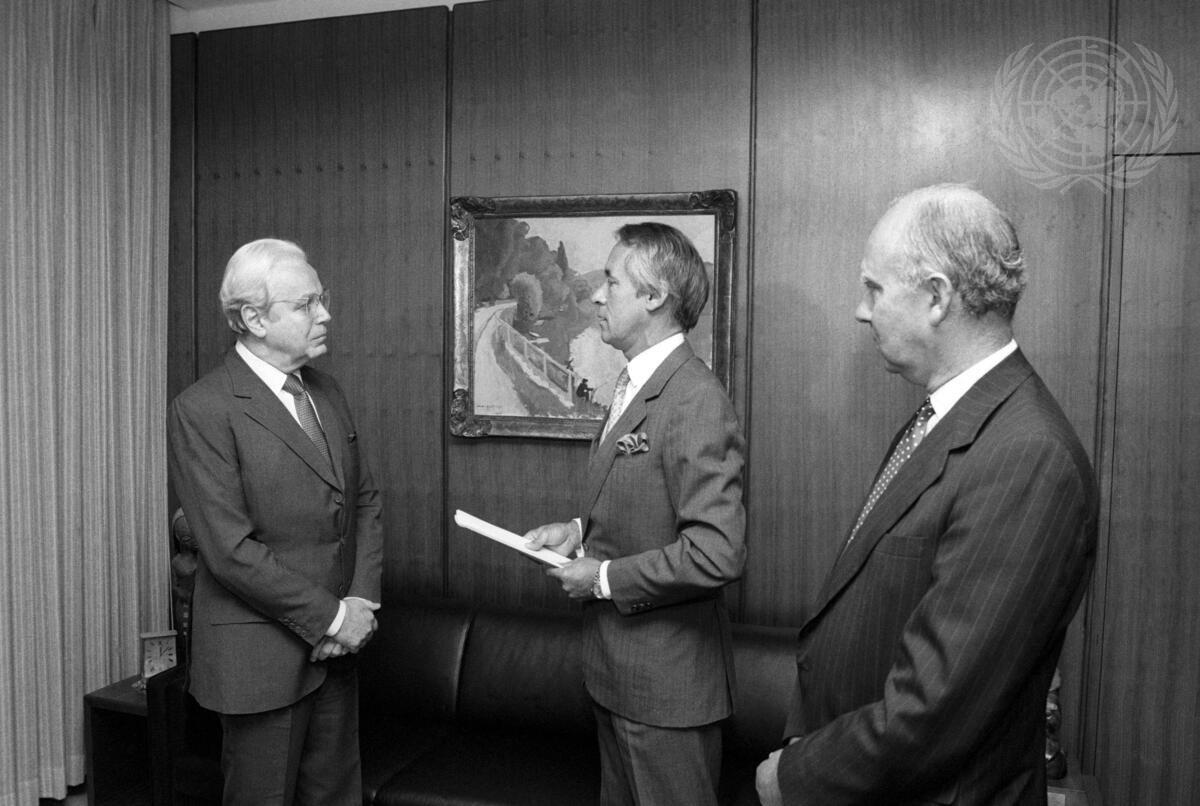 Secretary-General Javier Perez de Cuellar (left) meeting with Jean-Bernard Merimee (centre), Permanent Representative of France to the United Nations, and Sir David Hannay, Permanent Representative of the United Kingdom.