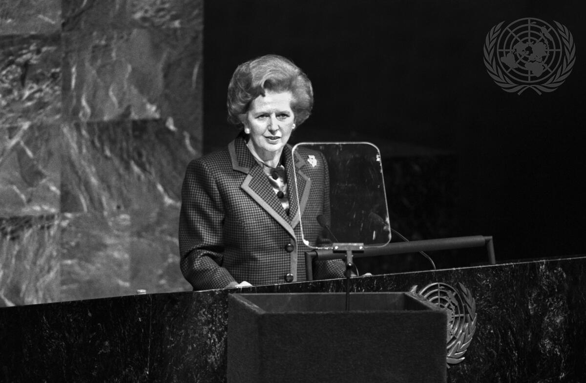 Margaret Thatcher, the Prime Minister of the United Kingdom of Great Britain and Northern Ireland, addresses the 44th session of the General Assembly.