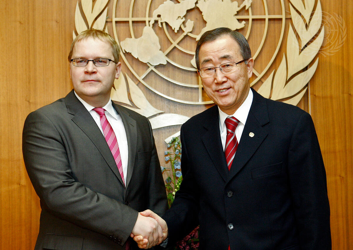 Secretary-General Ban Ki-moon (right) meets with Urmas Paet, Minister for Foreign Affairs of Estonia.