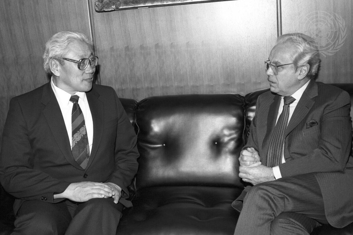 Secretary-General Javier Perez de Cuellar (right) meets with Dashiin Byambasuren, Deputy Foreign Minister of Mongolia.