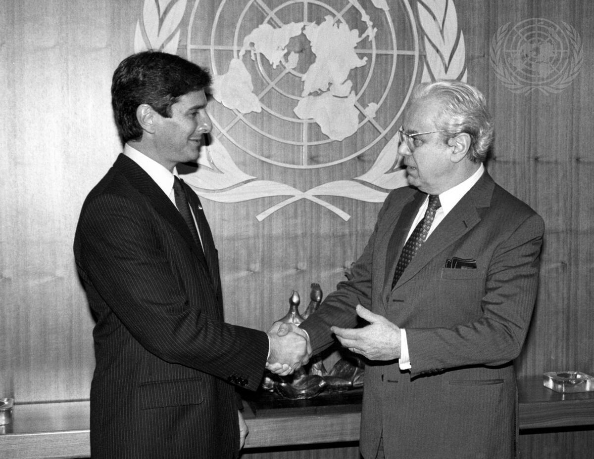 Secretary-General Javier Perez De Cuellar (right) meets with President-elect Fernando Collor De Mello of Brazil.