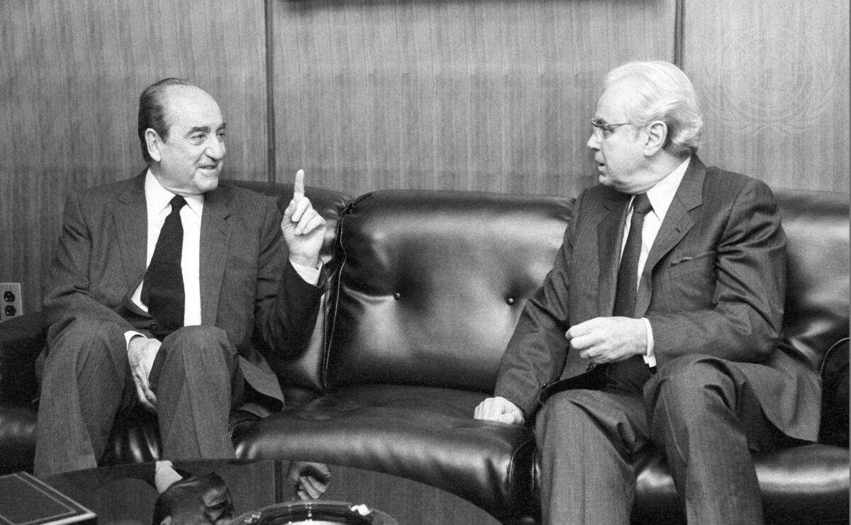 Secretary-General Javier Perez De Cuellar (right) meets with Prime