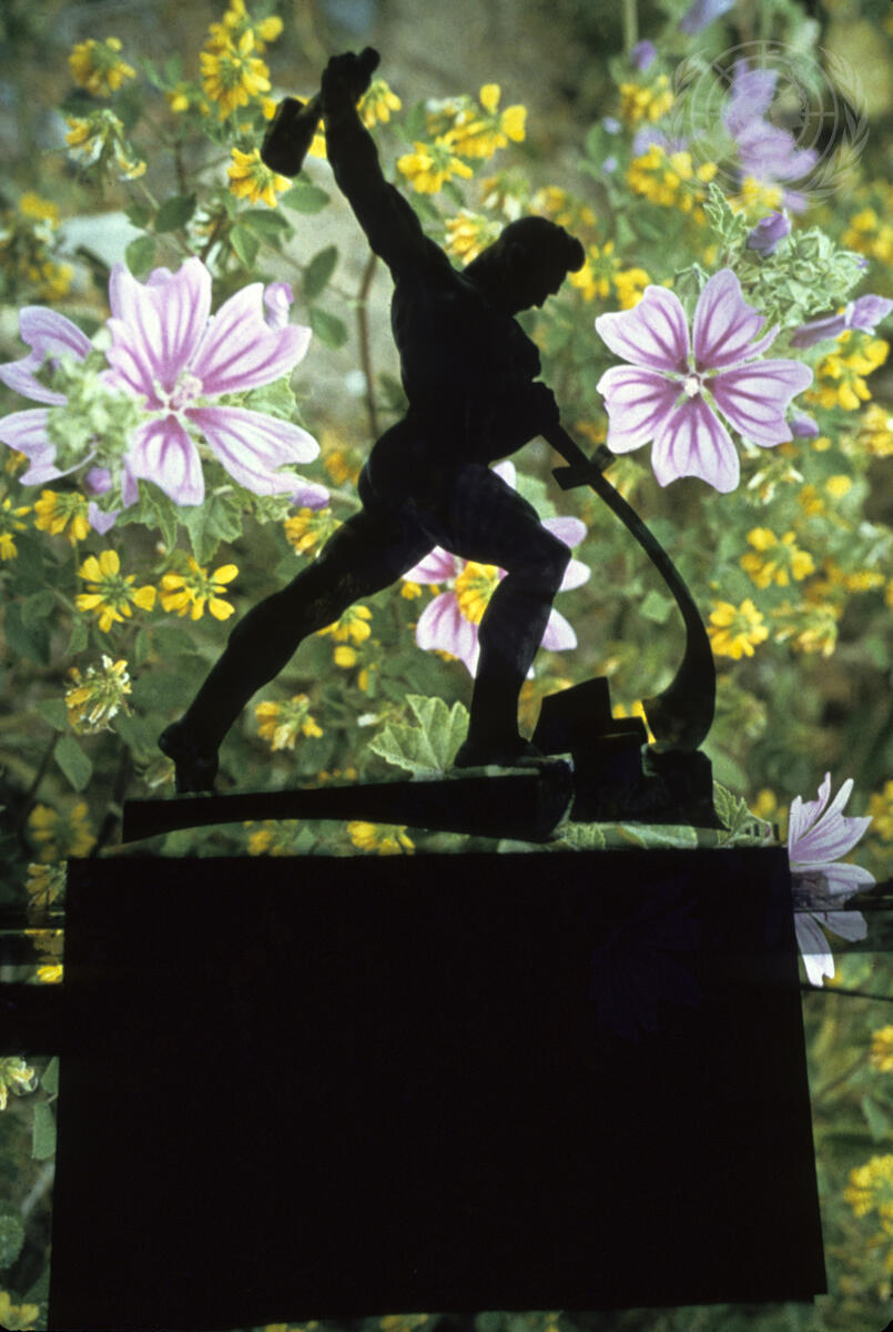 Photographic montage of the bronze statue by Evgeny Vuchetich entitled ""Let Us Beat Swords into Plowshares"" presented to the United Nations by the Soviet Union on 4 December 1959. The sculpture depicts a man holding a hammer in one hand and, in the other, a sword which he is making into a ploughshare. It symbolizes man's desire to put an end to war and convert the means, of destruction into creating tools for the benefit of all mankind. The statue is in the North Garden.