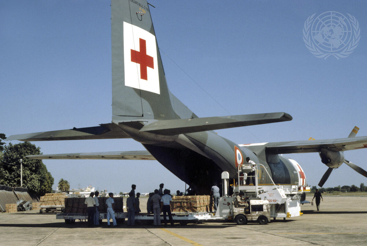 Medical supplies are unloaded from a Red Cross Plane at an airstrip in Thailand. The supplies will then be taken to refugee camps located along the border with Kampuchea. [No exact date]