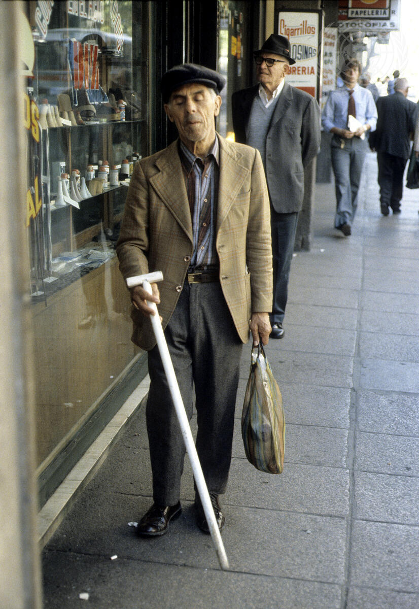 A blind person, finding his way home unaided in Montevideo. [1980]