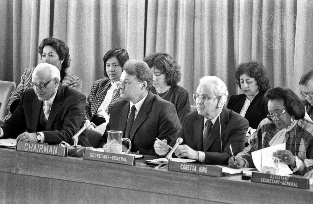 At the presiding table are (l to r) Peter Florin (German Democratic Republic), General Assembly President; Hennadiy I Udovenko (Ukrainian SSR), Acting Chairman of the Committee; Secretary-General Javier Perez de Cuellar and Correta King, wife of late Dr. Martin Luther King