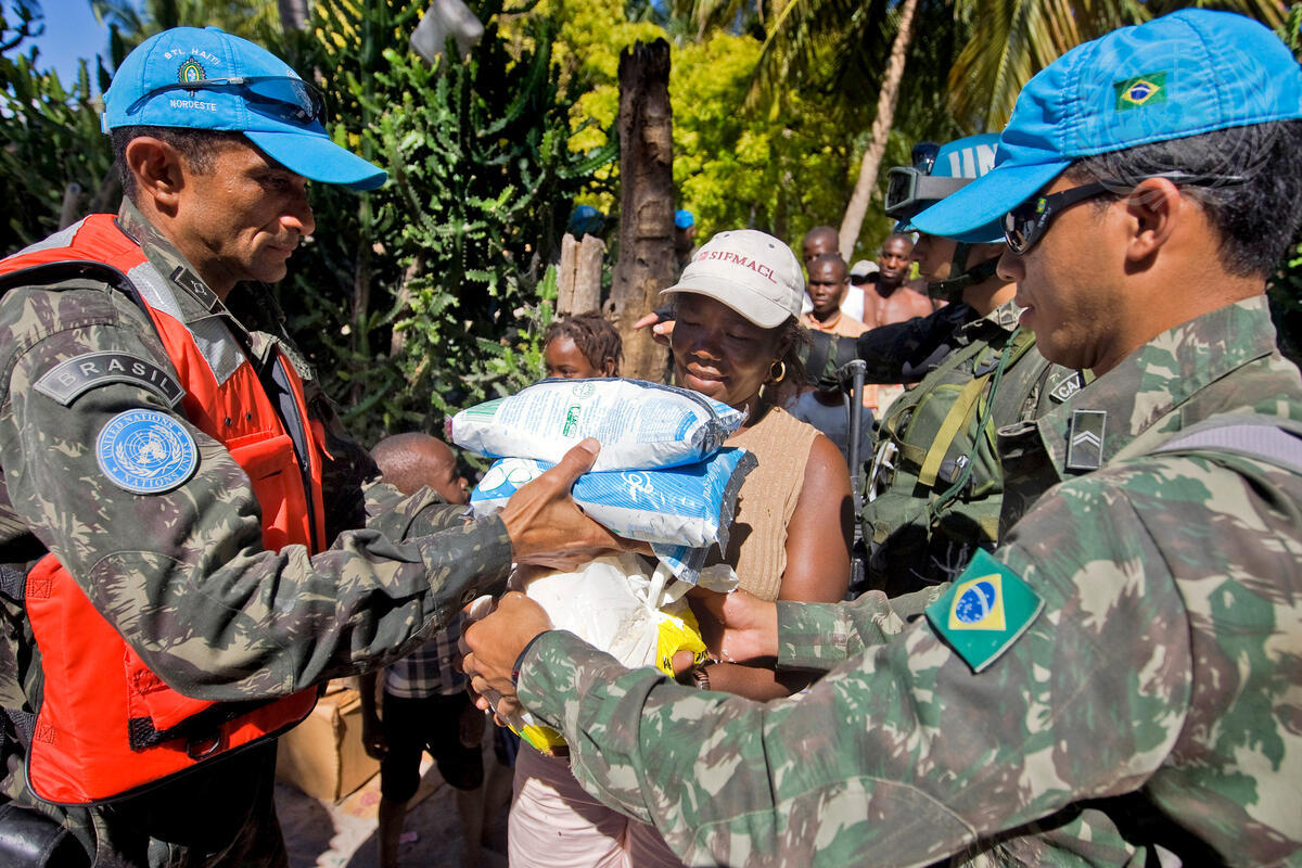 A woman receives food ration from a member of the Brazilian contingent of the United Nations Stabilization Mission in Haiti (MINUSTAH).