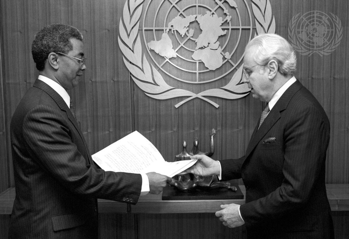 Ali Ahmed Elhouderi (left), Permanent Representative of the Socialist People?s Libyan Arab Jamahiriya to the United Nations, presenting his credentials to Secretary-General Javier Perez de Cuellar at United Nations Headquarters today.