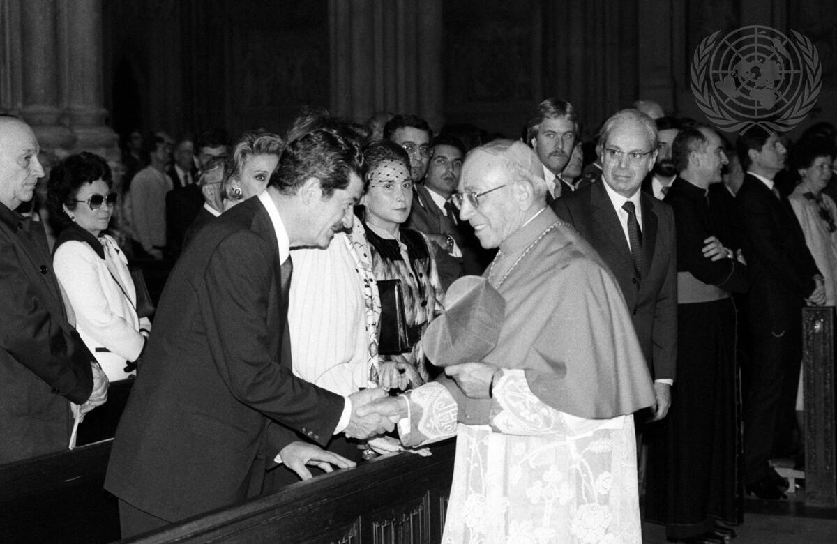 Agostino Cardinal Casaroli, Secretary of State of the Holy See and Special Envoy of Pope John Paul II, greeting General Assembly President Don Jaime de Pinies. Secretary-General Javier Perez de Cuellar is to the right.