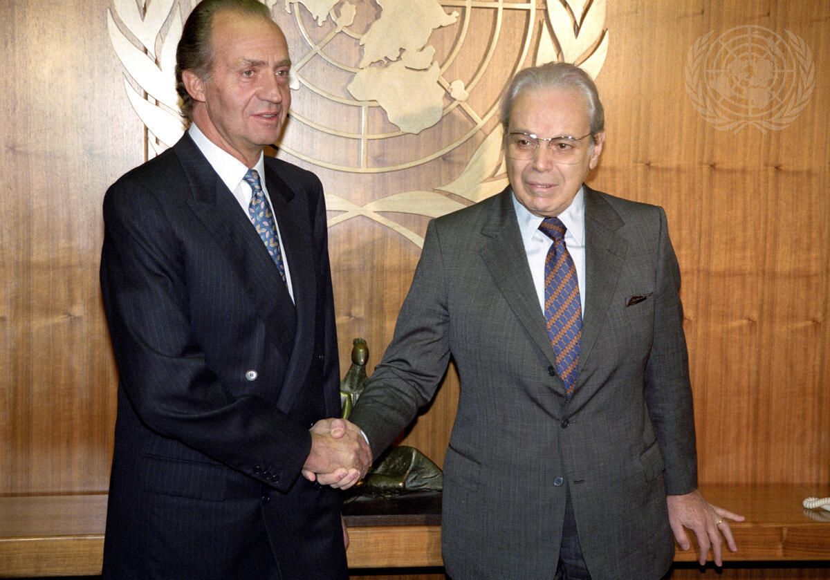 Secretary-General Javier Perez de Cuellar (right) meets with Don Juan Carlos I, the King of Spain.