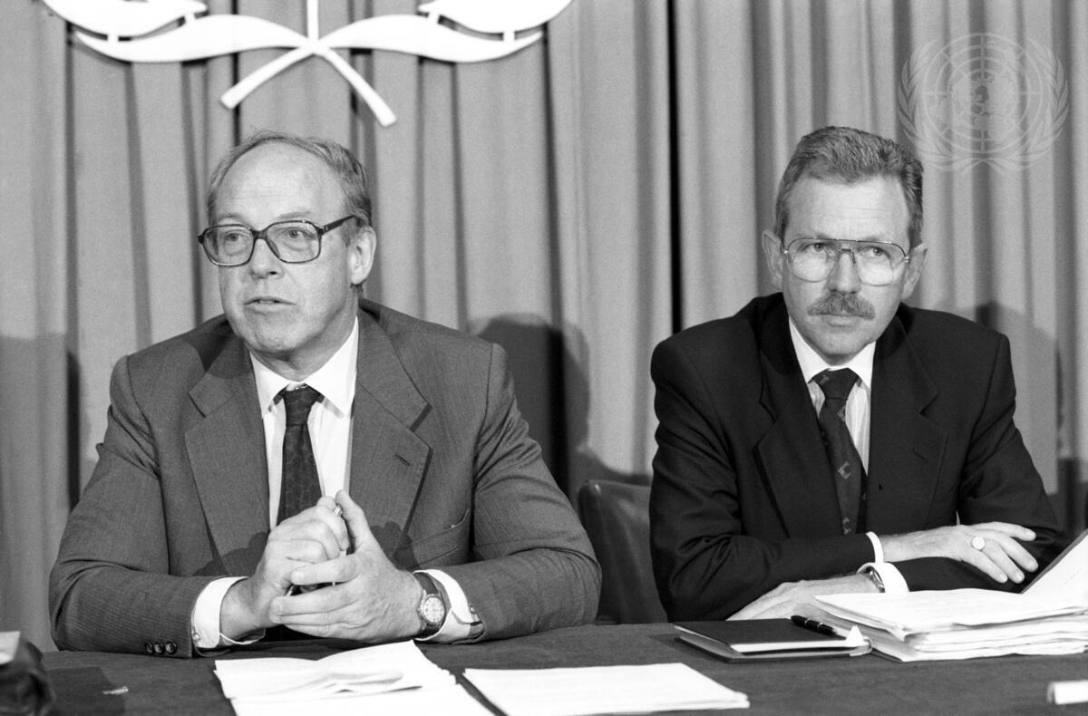 Hans Blix (left), Director-General of the Vienna-based International Atomic Energy Agency (IAEA), holds a press conference following a closed-session meeting with members of the Security Council. He spoke about the recent inspection of Iraq's nuclear facilities as well the future programmes of his agency.