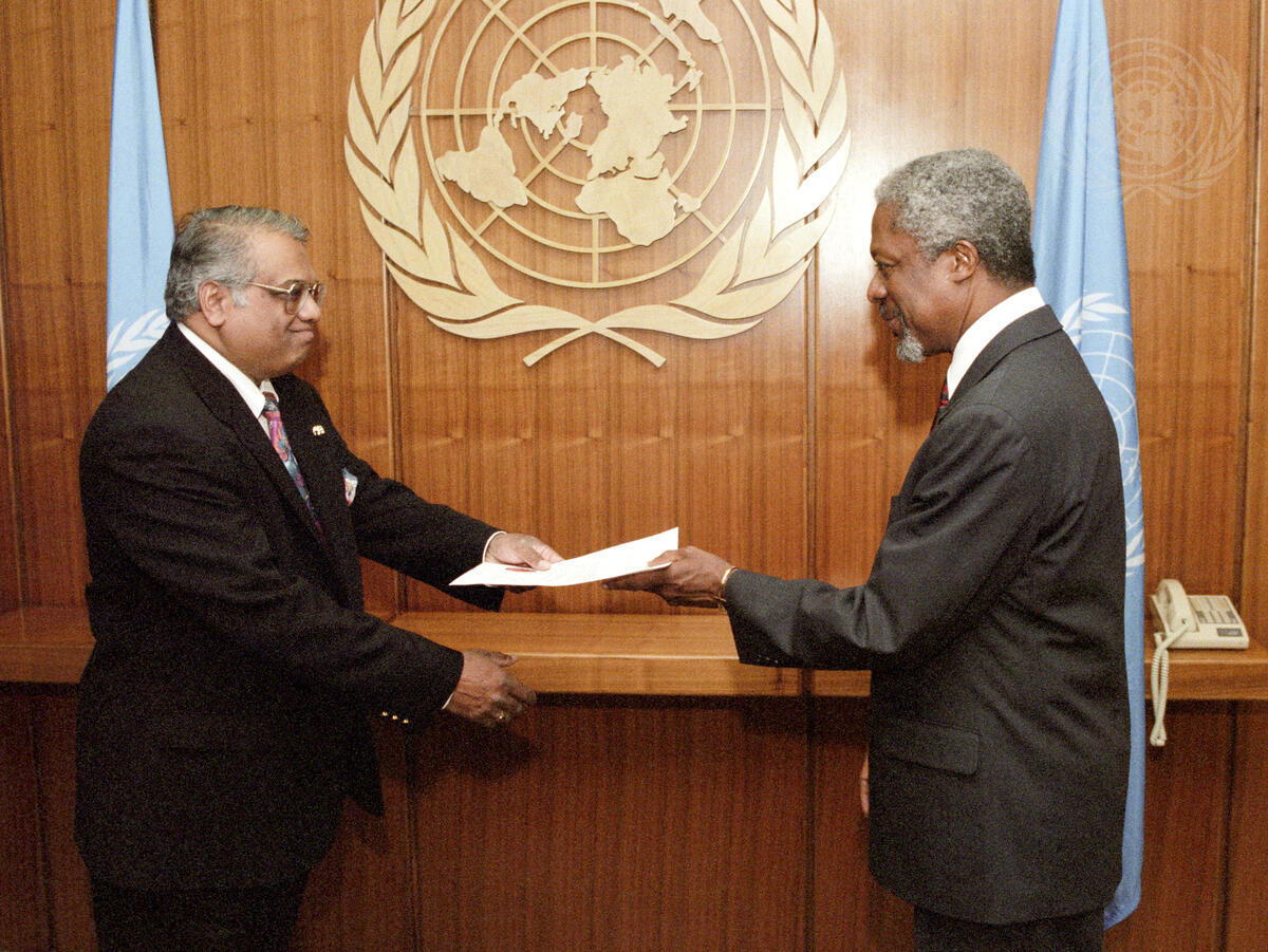Ambassador Subhas Chandra Mungra (left), Permanent Representative of the Republic of Suriname to the United Nations, presents his credentials to Secretary-General Kofi Annan.