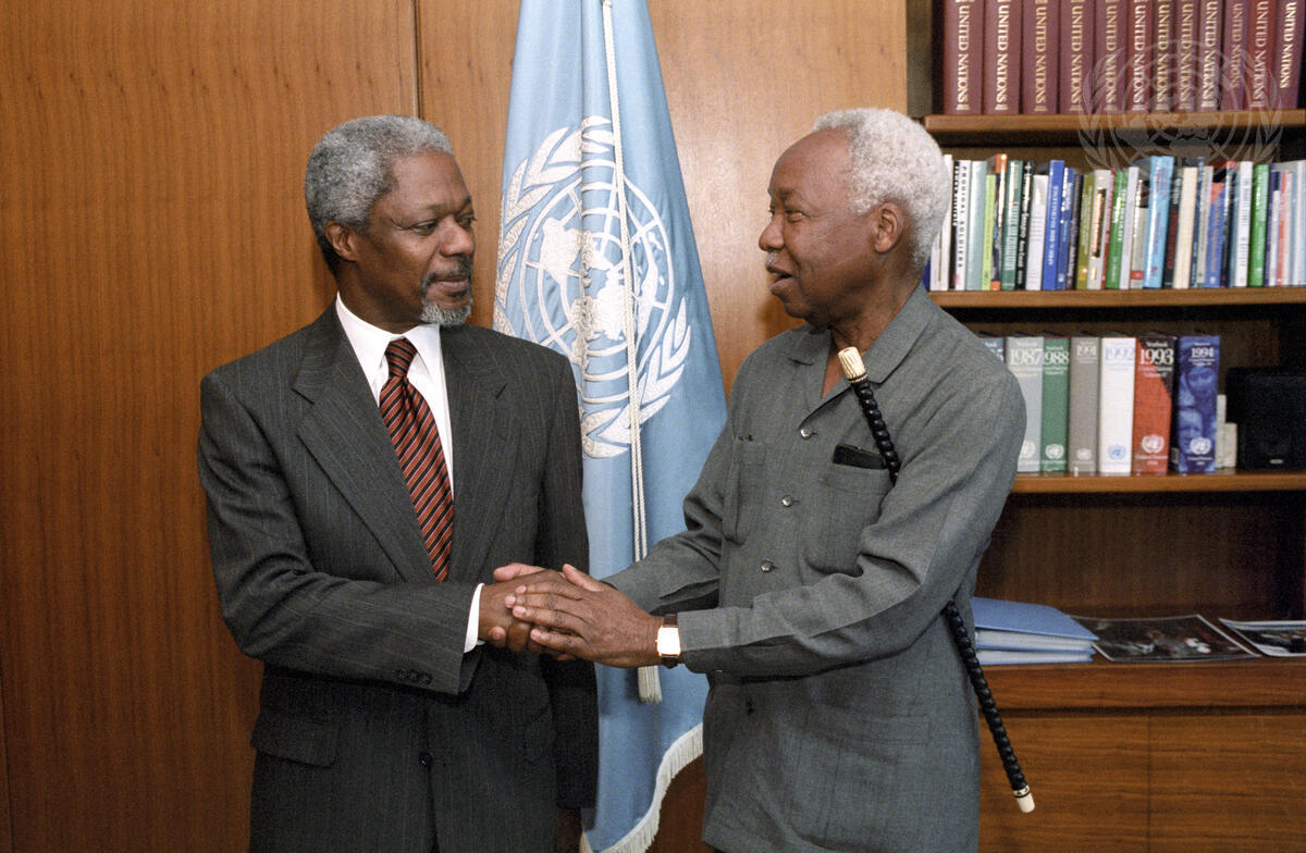 Secretary-General Kofi Annan (left) meets with Julius Nyerere, former President of the United Republic of Tanzania.