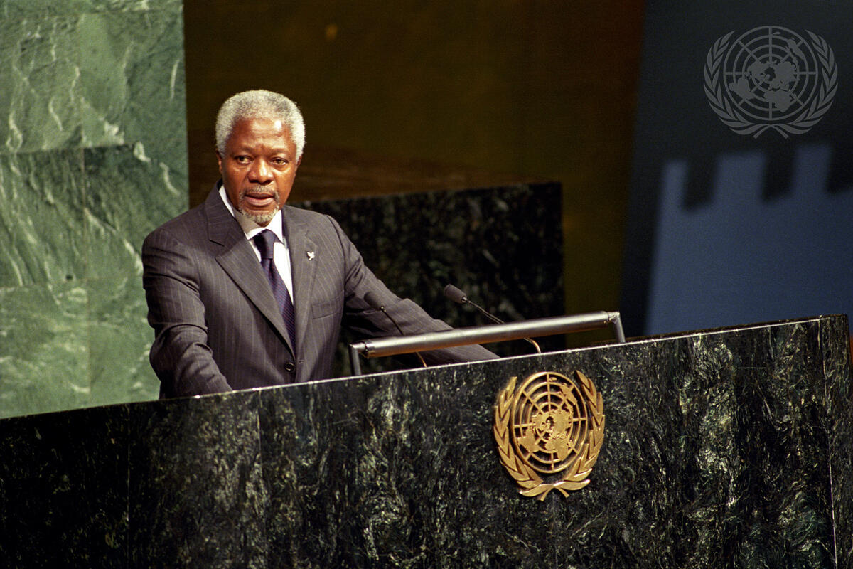 Secretary-General Kofi Annan addresses staff members gathered in the General Assembly Hall for a solemn ceremony expressing their solidarity with the Government and people of the United States and to extend sympathy to those affected by the 11 September terrorist attack in which airplanes flew into the New York City's World Trade Center and the Pentagon building in Washington, D.C.