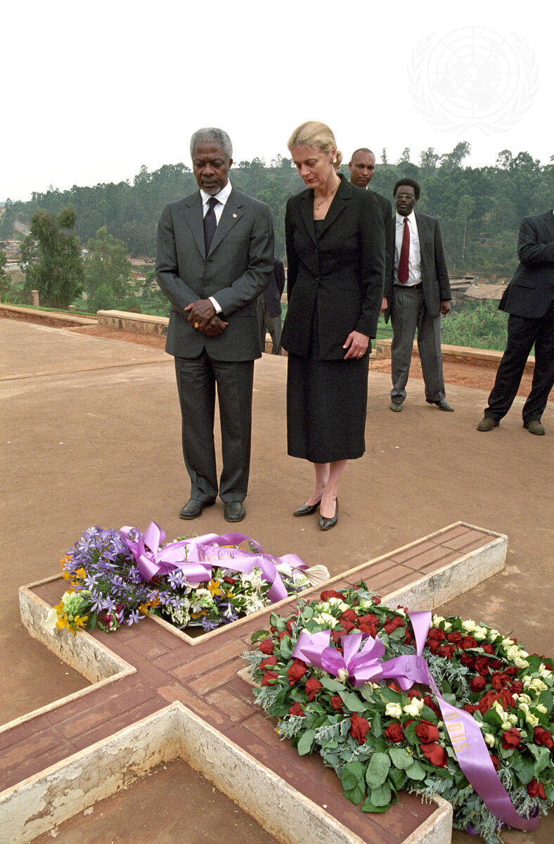 Secretary-General Kofi Annan (left) and Nane Annan lay a wreath at the Genocide memorial Site of Gisozi in Kicykiro District of Rwanda which bears the inscription: ""Souvenons-Nous""-""Never Forget"". This memorial is the resting place of approximately 200,000 Rwandans, most of them from Kigali City and the surrounding area.