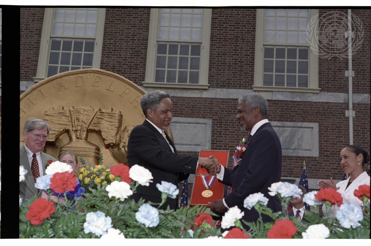 Secretary-General Kofi Annan (right) receiving the Philadelphia Liberty Medal from John F. Street, Mayor of Philadelphia.